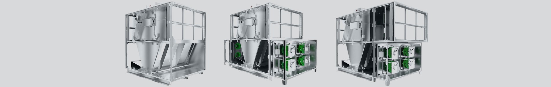 Модуль теплообменника HEX представляет собой комплекс взаимосвязанных противоточных сегментов гексагональных теплообменников, с интегрированным в них байпасом с воздушным клапаном (by-pass). Система направляющих обеспечивает равномерное прохождение воздуха через каждый сегмент. Для достижения минимальной длины модулей HEX применено разное внутреннее расположение теплообменников в зависимости от габаритов агрегата.