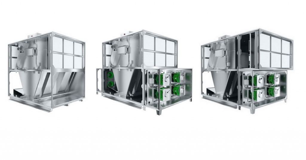 Модуль HEX доступен в конфигурации противоточных воздушных потоков с нижним выходом приточного воздуха. Модуль HEX, вместе с установленными вентиляционными секциями, образует базу компактного агрегата, при необходимости дополняемого иными функциональными модулями (нагревание, охлаждение и т.п.). Корпус компактного вентиляционного агрегата изготовлен из сэндвич-панелей с наполнением из минеральной ваты, покрытой с обеих сторон металлическим листом. Полностью готовый вентагрегат, а также программа подбора и расчета, сертифицированы Ассоциацией Eurovent
