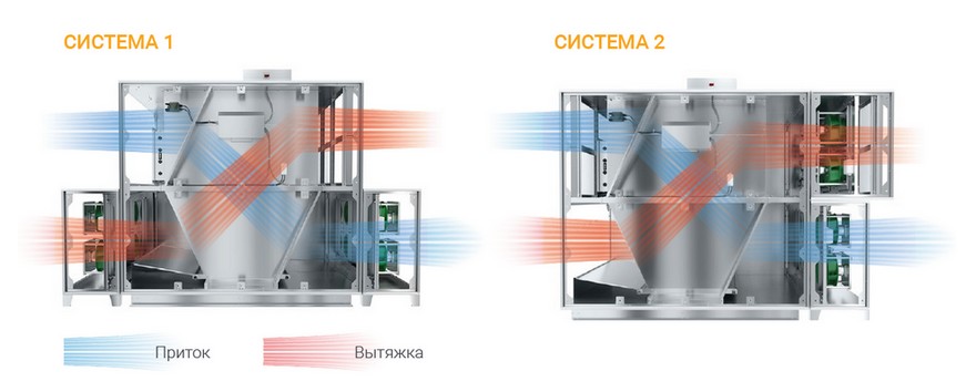 В компактных агрегатах возможны два варианта расположения вентиляционных групп относительно гексексносительно.