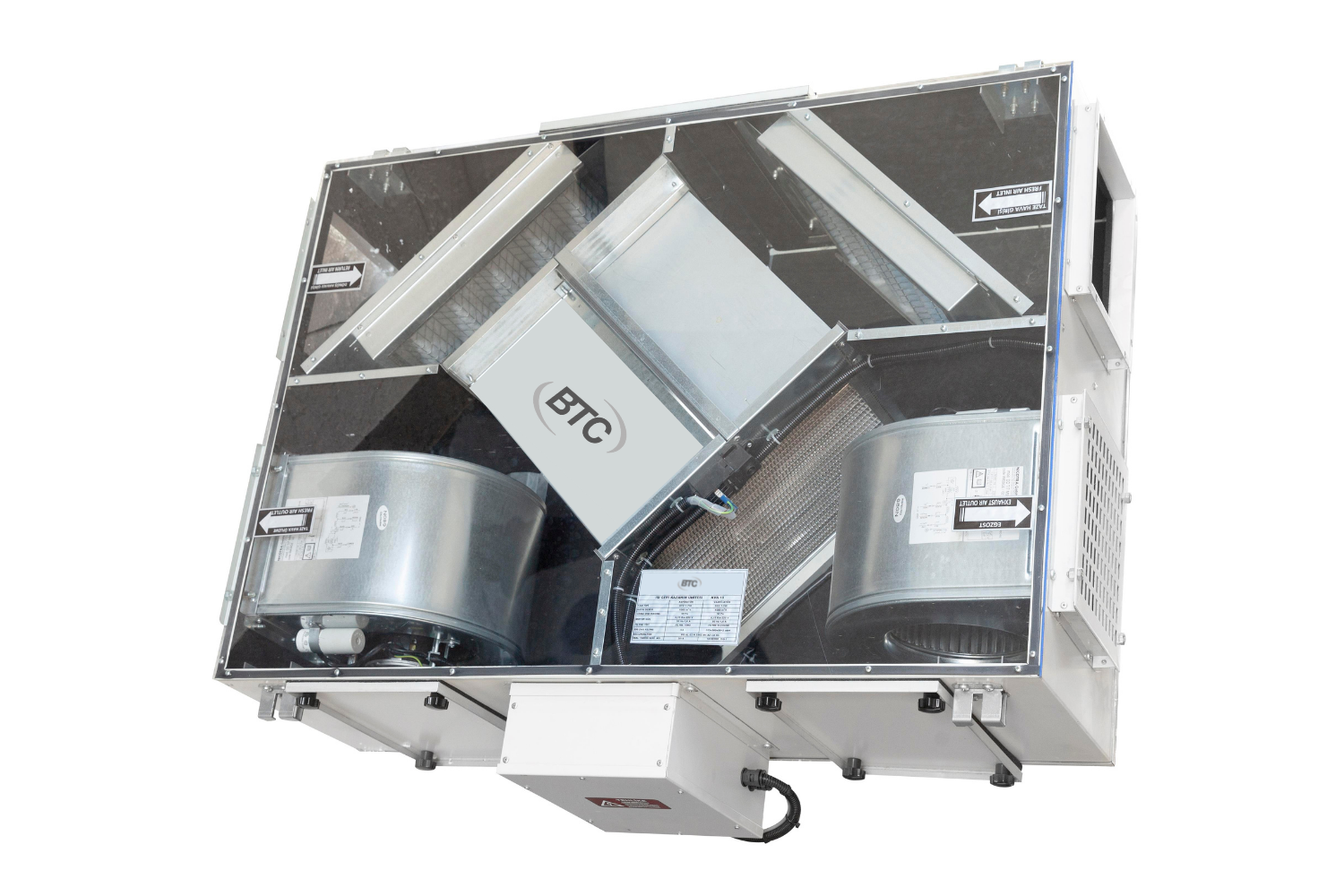 Компактные подвесные агрегаты для вентиляции и кондиционирования воздуха BTC Compact S имеют высокоэффективные перекрестноточные гексагональные рекуператоры с КПД до 90%.