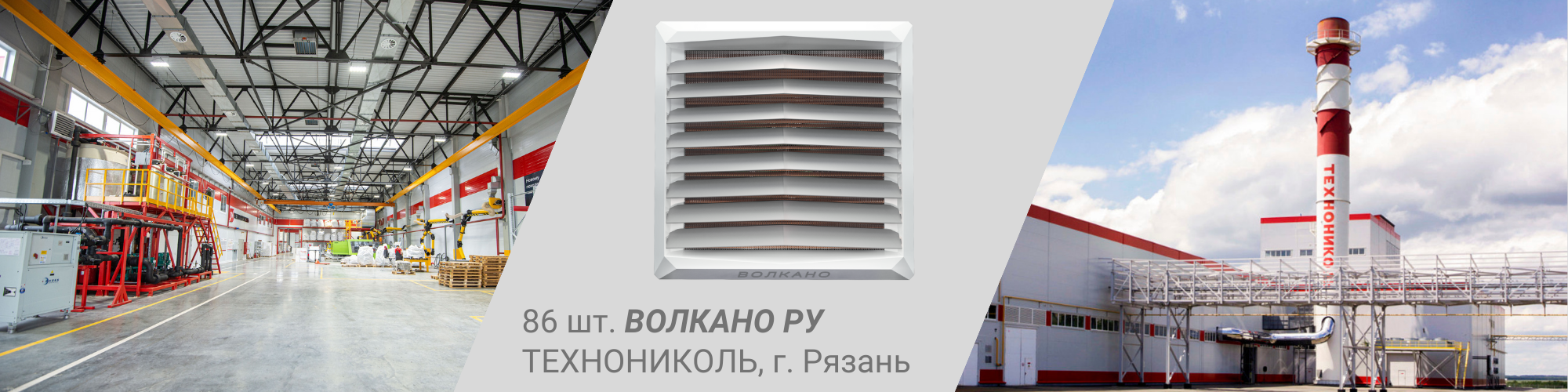 86 шт. воздушно-отопительных агрегатов ВОЛКАНО РУ установлены на заводе ТЕХНОНИКОЛЬ в Рязани. ТЕХНОНИКОЛЬ — производитель кровельных, гидроизоляционных и теплоизоляционных материалов.